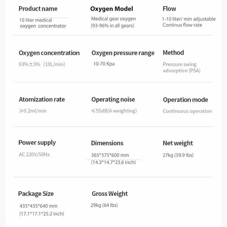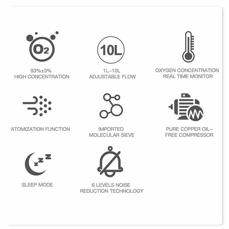 10 liter Continuous flow rate medical oxygen supplied by the concentrator is beneficial to cure the COPD disease or heart and blood vessel system chronic pulmonary system the brain and blood vessel system, chronic pulmonary tuberculosis and other oxygen lacking symptoms.