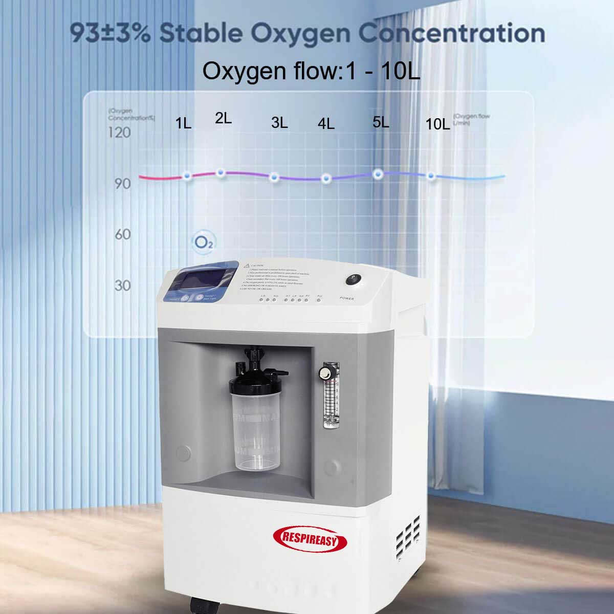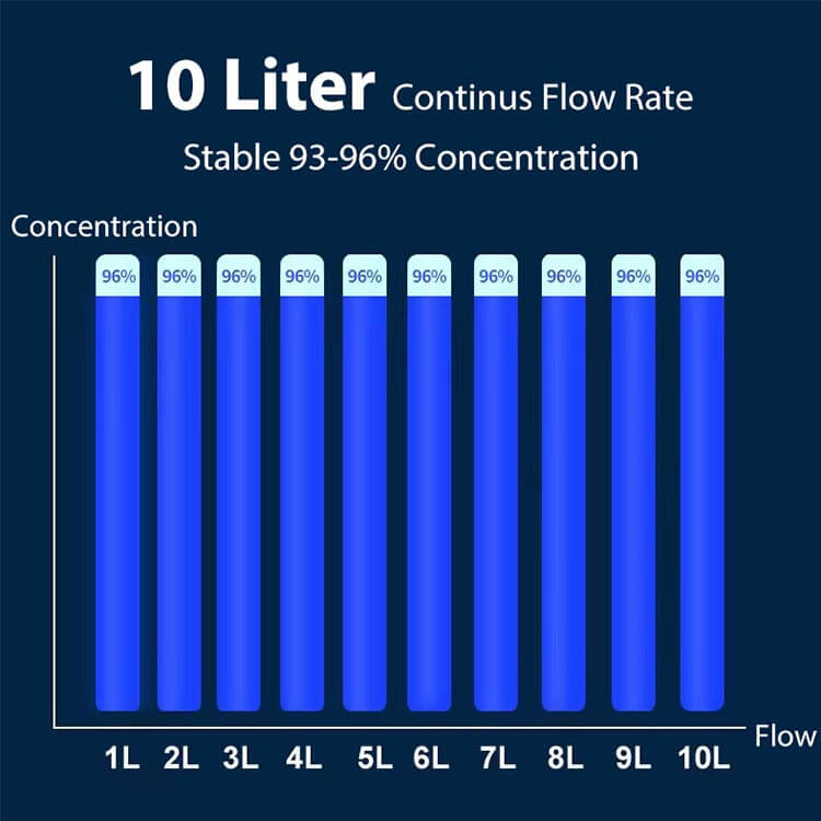 Steady continuous flow rate of 1-10 L/min with a constant O2 concentration of 93%±3%, sufficient flow oxygen.